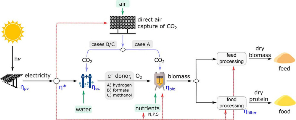 연구팀이 제창하는 SCP에 의한 식량 생산을 보면 태양광 발전으로 얻은 전기에너지는 대기로부터 이산화탄소를 분리 장치로 전송하고 이 이산화탄소에서 산소가 만들어진다. 이 산소와 태양광에너지에서 생물 반응기를 작동시켜 미생물을 배양해 미생물을 낳은 SCP를 원료로 해 식물과 동물용 사료가 만들어진다는 게 SCP에 의한 식량 생산 구조다.
