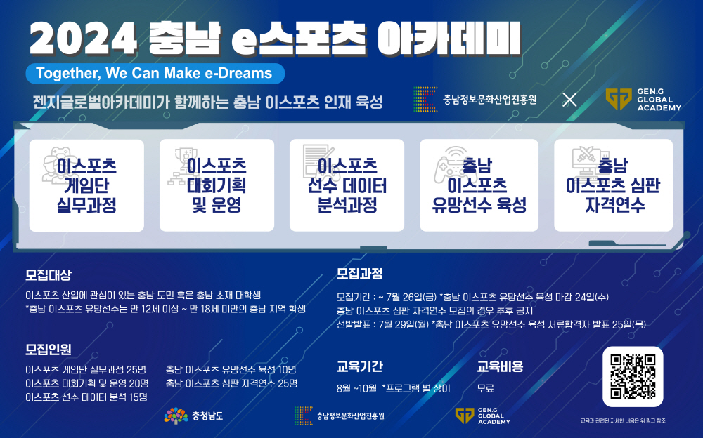 충남정보문화산업진흥원이 ‘2024 충남 e스포츠 아카데미’ 교육생을 모집한다. 이스포츠 산업 재능양성을 위한 프로그램은 이스포츠 게임단 실무, 대회 기획 운영, 선수 데이터 분석, 유망선수 지원, 심판 자격연수 등 5가지 전문분야를 포함한다. 지원자는 충남 도민과 대학생으로, 교육은 7월 26일까지 모집된다. 김곡미 원장은 이스포츠 산업 발전을 위해 인재양성의 중요성을 강조하며, 이스포츠 메카 조성을 희망한다.모집공고는 진흥원 홈페이지와 SNS를 통해 확인 가능하며, 참가신청은 QR코드 또는 디스코드 채널을 통해 가능하다.
