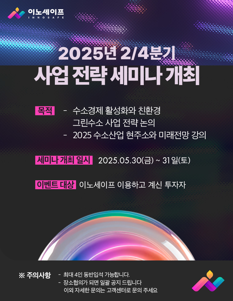 친환경 수소에너지 기업 이노세이프가 5월 30~31일 **‘2025년 2분기 사업전략 세미나’**를 개최한다. 이번 세미나는 기존 및 신규 투자자를 대상으로 진행되며, 그린수소 사업 전략과 수소경제 활성화 방안을 중심으로 논의가 이뤄질 예정이다. 특히 **‘2025 수소산업의 현주소와 미래전망’**을 주제로 한 강연이 마련돼 산업 흐름과 향후 시장 변화에 대한 인사이트를 제공한다. 이노세이프는 이번 행사를 통해 단순한 투자 브리핑을 넘어 수소경제 성장 가능성과 사업 확장 전략을 공유할 계획이다. 기업은 수소 생산·저장 기술과 모빌리티 연계 솔루션 개발 등 친환경 에너지 사업을 지속적으로 추진하며, 지속 가능한 수소 생태계 조성에 앞장설 방침이다.