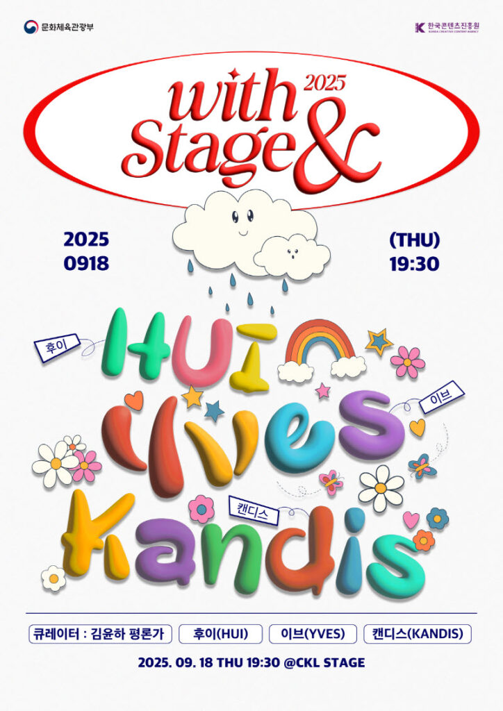 한국콘텐츠진흥원은 오는 9월 18일 서울 CKL스테이지에서 ‘2025 위드 스테이지 앤드’를 개최한다. 이번 공연은 CKL스테이지 개관 이후 처음 마련되는 K-팝 아이돌 현장 공연으로, 중소·신생 기획사 및 무소속 아티스트에게 실질적인 무대 기회를 제공한다. 후이, 이브, 캔디스 등 창작자형 아티스트 3팀이 참여해 자작곡과 퍼포먼스를 선보이며, 대중문화평론가 김윤하가 큐레이터로 나서 창작 과정에 대한 심층 대담도 진행된다. 공연은 전석 무료로 운영되며, CKL스테이지는 이번 행사를 통해 K-팝 산업의 다양성과 균형 성장을 도모하고 공공 공연장의 사회적 역할을 강화할 계획이다.