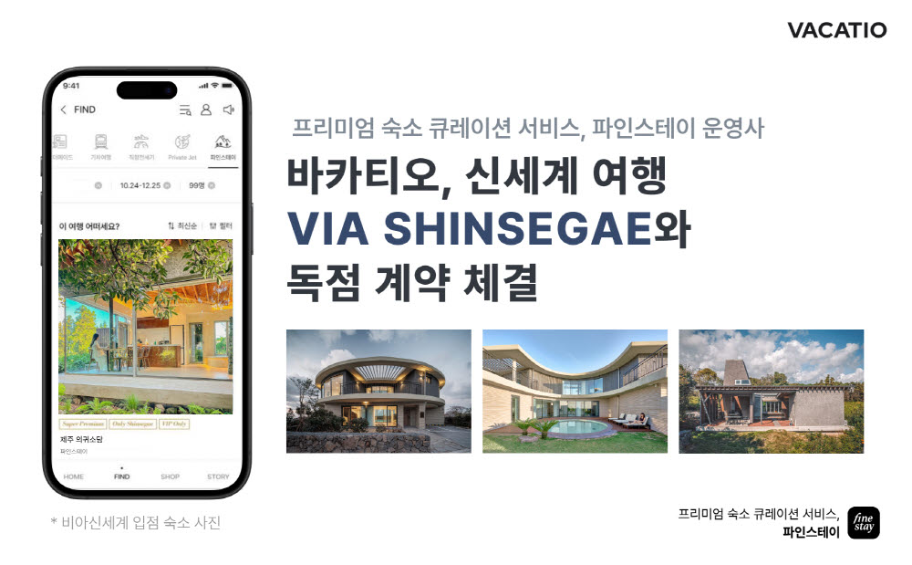 프리미엄 숙소 큐레이션 서비스 파인스테이 운영사 바카티오가 신세계백화점의 여행 플랫폼 비아신세계(VIA SHINSEGAE)와 독점 계약을 체결했다. 이번 협약으로 비아신세계에서 판매되는 고급 펜션 상품은 파인스테이에 입점된 숙소들로 구성된다. 신세계는 비아신세계를 통해 항공, 숙박 패키지 등 여행 전반을 아우르는 프리미엄 서비스를 선보이고 있으며, 특히 이번 파트너십을 통해 프리미엄 카테고리를 강화했다. 바카티오는 올인원 SaaS 파인호스트 개발사로, 기존에 운영하던 파인스테이 서비스에 입점된 고급 펜션 운영사들과의 네트워크를 보유하고 있다. 양사의 협력으로 비아신세계 고객은 검증된 고급 펜션을 보다 편리하게 예약할 수 있고, 숙소 운영자들은 신세계백화점의 여행 플랫폼을 통해 새로운 고객층을 만날 수 있게 됐다. 바카티오 지현준 대표는 “신세계백화점이라는 대형 유통·여행 채널과의 독점 협업으로 프리미엄 펜션 시장에서 새로운 기준을 제시하게 됐다”고 밝혔다.