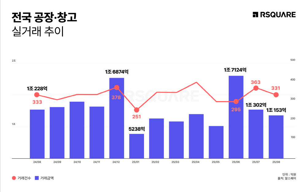 알스퀘어는 국토교통부 실거래가 자료를 기반으로 2025년 8월 전국 공장·창고 거래 동향을 발표했다. 총 거래규모는 1조 153억 원, 거래건수는 331건으로 집계되었으며, 이는 전월 및 전년 동월과 유사한 수준을 유지했다. 특히 대구 수성구 대흥동 창고시설의 1,790억 원 거래가 전체 시장의 17.6%를 차지하며 1조 원대 방어에 결정적인 역할을 했다. 알스퀘어 애널리틱스(RA)는 올해 1월 최저점 대비 거래규모가 약 2배 회복되었으며, 하반기에도 대형 거래가 시장 변동성에 큰 영향을 미 미칠 것으로 전망했다.