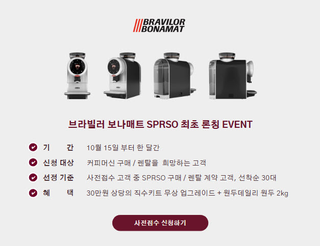 스프링온워드가 커피 머신 전문 유통기업 기센코리아와 손잡고 네덜란드 프리미엄 커피 머신 브랜드 브라빌러 보나매트의 대표 모델 SPRSO(스프레소)를 국내 오피스 시장에 독점 공급한다. 이번 협약을 통해 양사는 B2B 커피 시장에서의 입지를 강화하고 유통 라인업을 확대할 계획이다. 스프레소 머신은 원두 분쇄부터 추출까지 자동으로 이루어지는 ‘원두 투 컵’ 시스템과 9bar 고압 추출 기술로 카페 수준의 커피를 제공하며, 카푸치노 등 우유 음료 제조도 가능하다. 양사는 11월 중순 본격 판매에 앞서 10월 15일부터 한 달간 사전 접수를 진행하며, 선착순 30명에게는 30만 원 상당의 직수키트를 무상 제공하는 프로모션을 진행한다.