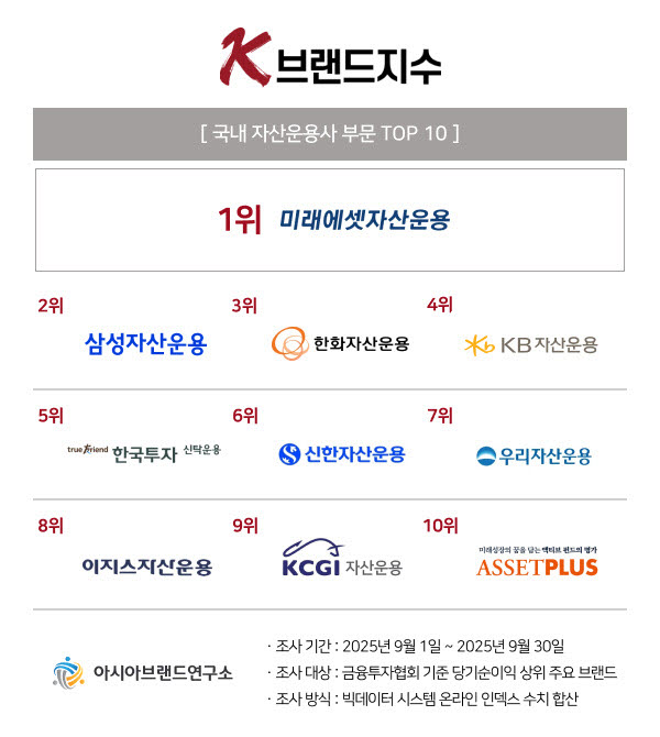 아시아브랜드연구소는 2025년 9월 자산운용사 부문 K-브랜드지수에서 미래에셋자산운용이 1위를 차지했다고 16일 발표했다. 삼성자산운용은 2위에 머물렀으며, 신한자산운용은 하락세를 보였다. 이번 조사는 9월 한 달간 온라인 빅데이터 1억 5천만여 건을 분석하여 진행됐다. 한정근 아시아브랜드연구소 대표는 운용자산 규모와 단기 수익률을 넘어 디지털 혁신, 투자자 신뢰 관리, 글로벌 네트워크 구축 등이 자산운용사의 핵심 경쟁력으로 부상하고 있다고 강조했다. 특히 미래에셋자산운용은 안정적인 브랜드 전략과 글로벌 포트폴리오 관리 역량으로 1위를 수성했다.
