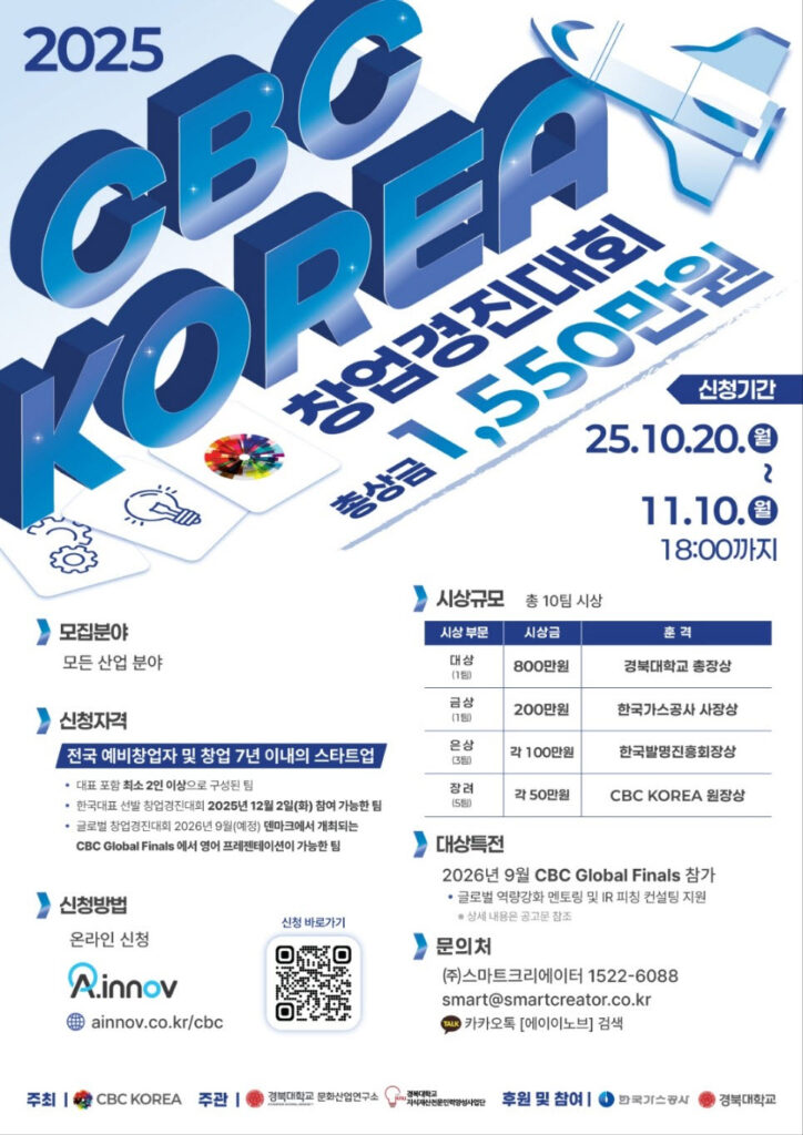 CBC KOREA가 주관하는 ‘2025 CBC KOREA 창업경진대회’가 오는 11월 10일(월) 18시까지 참가팀을 모집한다. 예비창업자 및 창업 7년 이내 스타트업이라면 2인 이상의 팀 단위로 참여할 수 있다. 산업 분야 제한 없이 모든 창업 아이디어를 대상으로 하며, 총상금 1,550만원이 걸려 있다. 대상팀은 경북대학교 총장상과 상금 800만원을 받으며, 2026년 9월 덴마크에서 열리는 ‘CBC Global Finals’에 한국 대표로 참가할 자격이 주어진다. 참가를 희망하는 팀은 2025년 10월 20일(월)부터 11월 10일(월) 18시까지 CBC 공식 페이지(https://ainnov.co.kr/cbc)를 통해 온라인으로 신청할 수 있다. 본 대회는 국내 창업 생태계 활성화와 청년 창업자들의 글로벌 경쟁력 강화를 목표로 한다.
