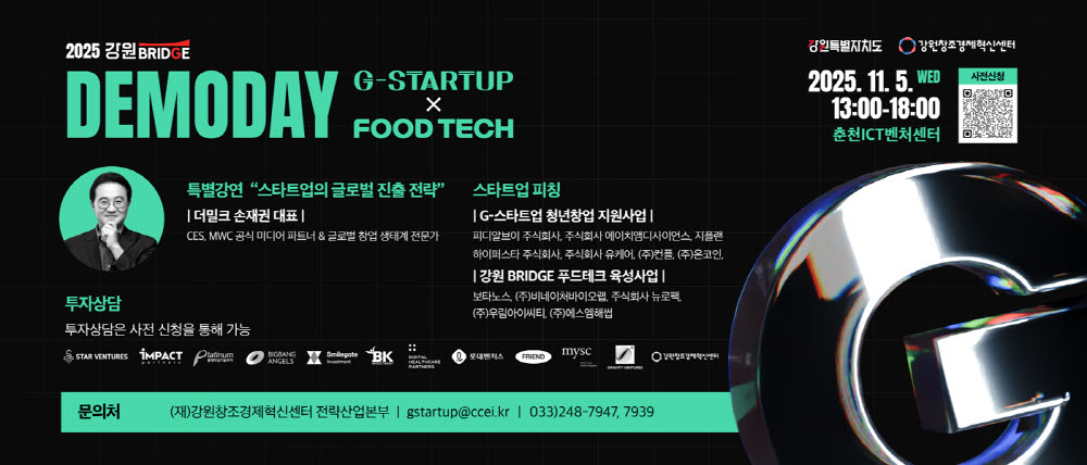 강원창조경제혁신센터는 오는 11월 5일 춘천ICT벤처센터 대회의실에서 ‘2025 강원BRIDGE DEMODAY [G-스타트업X푸드테크]’를 개최한다. 이번 데모데이는 G-스타트업 청년창업 지원사업과 강원 BRIDGE 푸드테크 육성사업 참여기업 12개사가 참가하여 기술력과 사업 성과를 알리고 투자 유치 및 협력 기회를 모색한다. 더밀크 손재권 대표의 특별 강연과 국내 주요 벤처캐피탈 및 투자사 10여 곳이 참여하는 1:1 맞춤형 투자상담회, 참가자 네트워킹 세션도 마련된다. 창업과 투자에 관심 있는 누구나 강원혁신센터 홈페이지를 통해 무료로 사전 신청할 수 있다. 강원혁신센터는 유망 스타트업과 투자자, 유관기관이 한자리에 모여 실질적인 투자로 이어질 수 있는 기회를 만들 것으로 기대하고 있다.