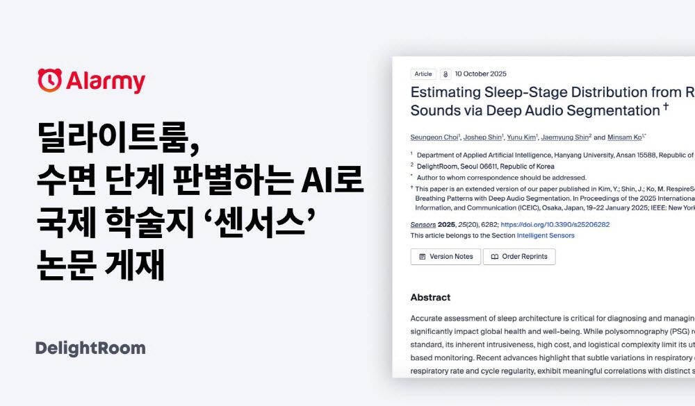 글로벌 수면-기상 솔루션 ‘알라미’ 운영사 딜라이트룸이 자체 개발한 수면 단계 판별 인공지능(AI) 모델 연구 논문을 SCI급 국제 학술지 ‘센서스’에 발표했다. 이 모델은 수면 호흡 소리를 정밀하게 분석하여 깊은 수면, 얕은 수면, 렘수면 등 사용자의 수면 단계를 90% 정확도로 판별한다. 외부 소음이나 뒤척이는 소리 등 잡음 속에서도 높은 분석 정확도를 유지하며, 기존 방법론 대비 호흡 주기 예측 정확도를 30~60% 향상시키고 수면 단계 분석 오차를 20% 이내로 단축했다. 딜라이트룸은 이 기술을 알라미에 적용해 사용자의 수면 효율과 회복 정도를 알려주고 적합한 알람 시점을 제안하는 ‘수면 코치’ 서비스로 고도화할 계획이다. 별도 웨어러블 기기 없이 스마트폰 내장 마이크 센서만으로 수면 품질을 정밀하게 분석할 수 있게 된다. 딜라이트룸은 알라미를 수면 전 과정을 개선하는 슬립테크 ‘슈퍼앱’으로 발전시키는 것을 목표로 연구 개발을 지속하고 있다.