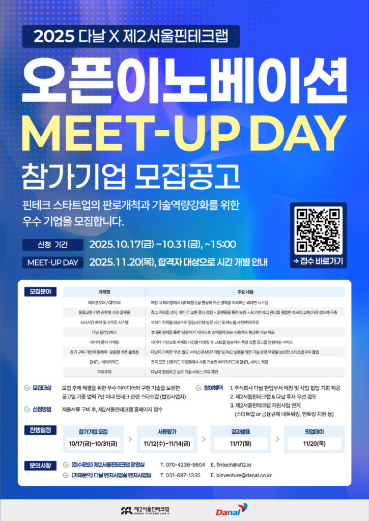 제2서울핀테크랩이 핀테크 스타트업의 판로 개척과 기술 역량 강화를 위해 다날과 손잡고 ‘2025 다날X제2서울핀테크랩 오픈이노베이션 밋업데이’를 개최한다. 10월 22일 발표된 이 프로그램은 대·중견기업의 기술 수요를 해결할 유망 스타트업을 발굴하고 협력 모델을 구축하는 데 목적이 있다. 참가 스타트업은 테이블 오더, 물물교환 기반 순환형 거래 플랫폼, 데이터 문자 마케팅 등 다날 현업 부서가 제시한 과제에 대한 아이디어와 기술을 제출하게 된다. 서류 평가를 통과한 기업은 오프라인 밋업데이에 참여해 다날 실무진과 협업 아이템을 논의하며, 선정 시 후속 사업화 지원, 기술 멘토링, 투자 검토 기회 등을 얻는다. 모집은 10월 31일까지 진행되며, 업력 7년 이내 핀테크 관련 스타트업이라면 제2서울핀테크랩 홈페이지를 통해 신청할 수 있다.