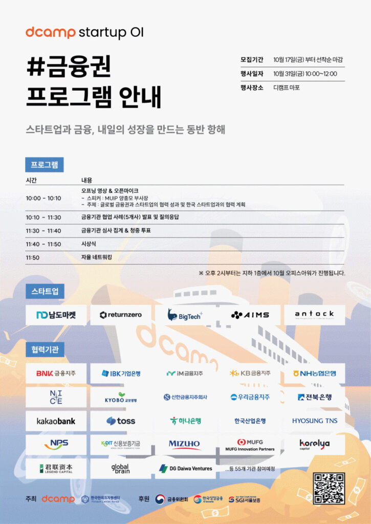 디캠프와 한국핀테크지원센터가 오는 10월 31일 마포 프론트원에서 ‘디캠프 스타트업OI \#금융권’ 행사를 개최한다. 이번 행사에서는 금융기관과 협업한 우수 사례를 발표할 최종 5개 스타트업이 무대에 오른다. 선정된 스타트업은 남도마켓, 리턴제로, 에임스, 빅테크플러스, 앤톡으로, 각각 유통 혁신, 음성인식 AI, 인슈어테크, 프롭테크, 금융 데이터 전문 분야에서 활약하고 있다. MUFG 이노베이션 파트너스의 양충모 부사장의 오픈마이크로 시작되는 이번 행사는 스타트업 발표와 질의응답으로 진행되며, 금융기관 심사위원단의 평가와 청중 투표가 반영된다. ‘올해의 스타트업(금융위원장상)’ 등 다양한 시상이 예정되어 있으며, 우수 스타트업에게는 1,000만 원 상당의 혜택이 제공된다. 19개 시중은행을 포함한 국내외 55개 금융기관 및 VC가 참여하여 스타트업과 금융권의 협력의 장을 마련한다.