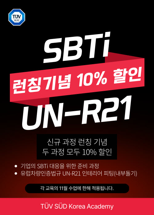 글로벌 시험인증기관 티유브이슈드(TUV SUD)는 11월, 기업의 온실가스 감축 목표 달성(SBTi) 준비 과정과 유럽 차량 내 장비 안전성 평가인 UN-R21(Interior Fittings) 레벨 1 교육 과정을 새롭게 개설한다고 밝혔다. 이번 프로그램은 글로벌 기후 목표 및 안전 규제 대응 역량 강화를 위한 실무 중심 교육으로, 국내 기업들이 변화하는 국제 기준에 선제적으로 대응할 수 있도록 지원한다. SBTi 과정은 11월 27일, UN R21 과정은 11월 28일에 개최되며, 오픈 기념으로 모든 수강생에게 10% 할인 혜택이 제공된다.