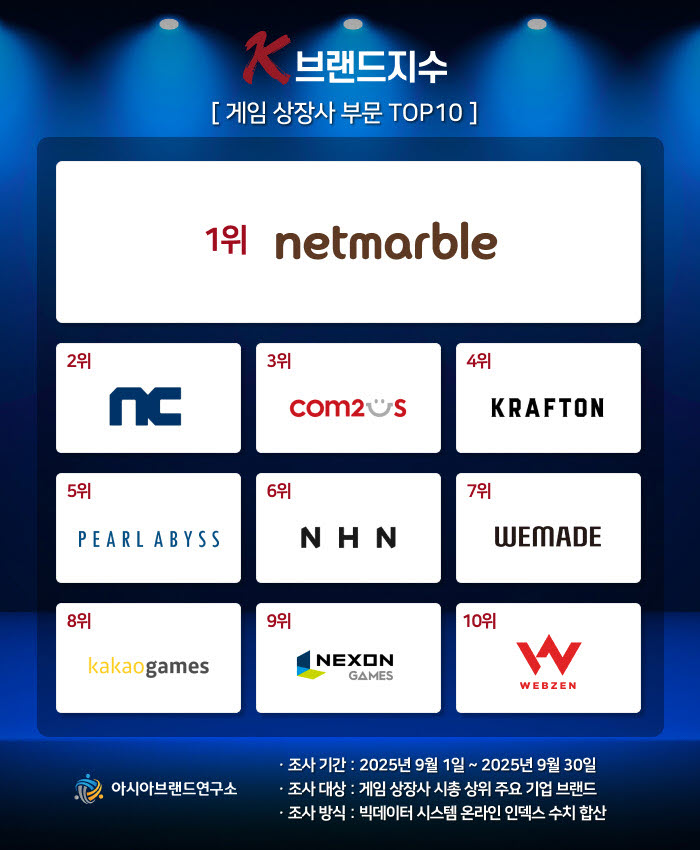 아시아브랜드연구소는 9월 ‘K-브랜드지수’ 게임 상장사 부문에서 넷마블이 1위를 차지했다고 24일 발표했다. 엔씨소프트가 2위, 컴투스가 크래프톤을 제치고 3위에 올랐다. 이번 조사는 2025년 9월 1일부터 30일까지 온라인 빅데이터 777만 6561건을 분석한 결과다. 한정근 아시아브랜드연구소 대표는 국내 게임사의 브랜드 가치가 콘텐츠 흥행을 넘어 지속 가능한 팬덤 관리, 글로벌 확장성, 개발사 신뢰도 등 복합적 구조로 변화하고 있다고 평가했다. 또한, 카카오게임즈와 웹젠의 TOP10 재진입은 중견 게임사의 콘텐츠 다양화와 브랜드 재평가를 의미하며, 신작 성과보다 이용자 커뮤니티와의 신뢰 구축이 핵심 요인임을 강조했다.