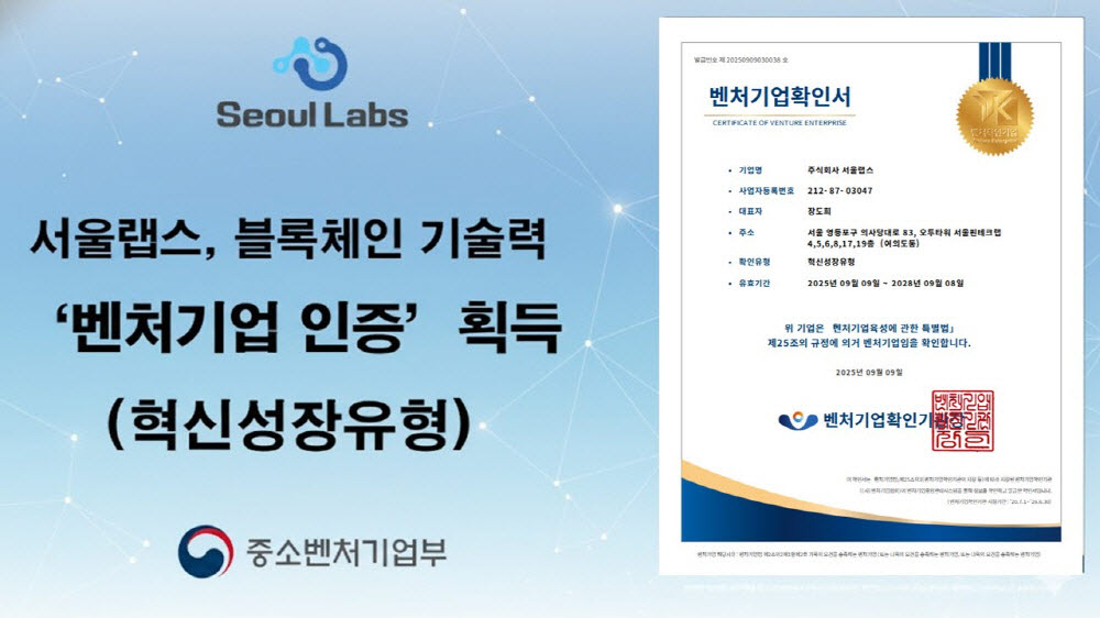 블록체인 메인넷 및 AI 핀테크 솔루션 개발 기업 서울랩스가 중소벤처기업부로부터 ‘벤처기업 인증(혁신성장유형)’을 공식 획득했다. 이번 인증은 기술실사와 외부평가를 거쳐 기술력과 사업성을 모두 인정받은 결과다. 특히 블록체인 분야는 기술 평가가 복잡하고 규제 불확실성 등으로 인해 벤처기업 인증이 어려운 분야로 알려져 있어, 서울랩스의 독자적인 기술력이 더욱 주목받고 있다. 서울랩스는 고성능 블록체인 메인넷, AI 기반 DID 기술을 적용한 ‘슈퍼월렛’, 법정화폐 담보 스테이블코인 발행 및 유통 플랫폼을 자체 기술로 개발해 왔다. 이번 인증 과정에서 이 핵심 기술들의 실용성, 확장성, 시장성이 높은 평가를 받았다. 서울랩스는 이번 벤처기업 인증을 통해 법인세·소득세 감면, 정책자금 우대 등 폭넓은 정책적 지원을 받게 되며, 이를 바탕으로 기술 투자 확대와 국내외 시장 확대에 적극 나설 계획이다. 장도희 서울랩스 대표는 “기술력과 사업성을 공식적으로 인정받아 매우 뜻깊다”며 글로벌 진출과 국내 공공 협력사업에 박차를 가하겠다고 밝혔다.