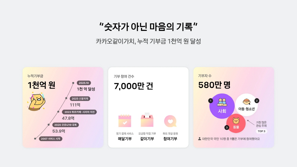 카카오의 사회공헌 플랫폼 ‘카카오같이가치’가 누적 기부금 1천억 원을 넘어섰다. 2007년 출범 이후 18년간 580만 명이 참여해 7천만 건의 기부가 이뤄졌으며, 재난 복구와 아동·청소년, 동물 보호 등 다양한 분야에서 공익 프로젝트 2만 건이 진행됐다. 특히 올해 3월 산불 피해 복구에 111억 원이 모이며 최대 모금액을 기록했다. 카카오는 이를 기념해 11월 말까지 ‘매달기부’ 이벤트를 진행하며, 참여자에게 카카오페이 상품권을 제공한다. 해당 서비스는 6개 주제 중 하나를 선택해 정기 기부하는 방식으로 운영된다. 카카오는 앞으로도 누구나 쉽게 나눔에 참여할 수 있는 환경을 조성해 나갈 계획이다.