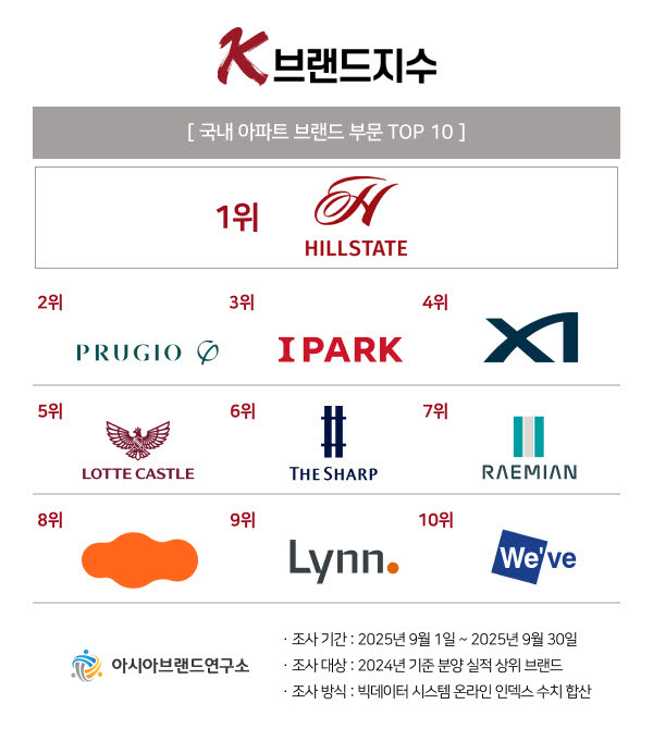 빅데이터 평가 기관인 아시아브랜드연구소는 ‘K-브랜드지수’ 아파트 브랜드 부문 1위에 힐스테이트가 선정되었다고 30일 발표했다. 2025년 9월 한 달간의 온라인 빅데이터 3403만여 건을 분석한 결과다. 힐스테이트는 주거 품질과 라이프스타일의 감성적 결합이 핵심 요인으로 작용하며 브랜드 파워를 입증했다. 푸르지오가 아이파크를 제치고 2위에 올랐으며, e편한세상이 신규 진입하며 실거주 중심의 시장 인식 변화를 반영했다. 반면 스위첸은 대중 인식 노출 빈도 감소와 브랜드 소통 지표 약세로 TOP10에서 탈락했다. 아시아브랜드연구소는 K-브랜드지수가 기존 빅데이터 분석 시스템과 달리 자문위원단의 검증을 거쳐 진행된다고 밝혔다.