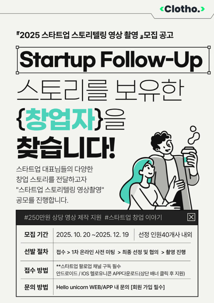 클로토의 정부지원사업 행정관리 SaaS ‘헬로유니콘’이 운영하는 유튜브 채널 ‘스타트업 팔로업(Startup Follow-Up)’이 100편 이상의 스타트업 스토리 영상을 공개하며 누적 조회수 100만 회를 돌파했다. 2024년부터 연 2회 정기적으로 운영되는 이 프로젝트는 스타트업 대표들이 직접 출연해 창업 여정과 사업 운영의 현실적인 이야기, 후배 창업자들을 위한 조언을 진솔하게 전달하는 콘텐츠다. 모든 영상은 무상으로 제작되며, 스타트업 규모나 단계와 관계없이 누구나 신청할 수 있다. 헬로유니콘 측은 “단순한 인터뷰가 아닌, 창업가의 현실적 경험과 진심을 전달하는 ‘기록형 콘텐츠’라는 점에서 의미가 크다”고 설명했다. 2025년 상반기에도 영상 제작 프로그램을 운영했으며, 10월부터는 K-Startup 공식 사이트에서도 영상 제작 신청이 가능하다. 하반기에는 20개사 이상을 추가로 선정해 무상 영상 제작을 지원할 계획이다. 이현석 클로토 대표는 “스타트업 팔로업은 창업가들의 고민과 성장 과정을 기록하고 공유하는 창구”라며, 앞으로도 스타트업 대표들의 생생한 이야기를 담아 다른 창업자들에게 공감과 용기를 전할 것이라고 밝혔다.
