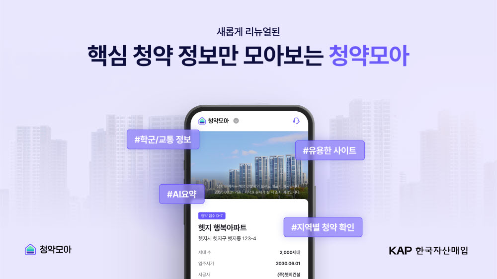 한국자산매입이 청약 정보 플랫폼 ‘청약모아’를 전면 개편했다. 이번 리뉴얼을 통해 ‘청약모아’는 단순 정보 나열 방식에서 벗어나 ‘단지별 종합 정보 페이지’ 중심의 탐색형 플랫폼으로 변화했다. 전국 아파트 단지 정보와 주요 부동산 플랫폼 데이터를 연계하여 분양 일정, 청약 조건, 주택형, 특별공급 현황 등 핵심 정보를 통합 제공한다. 또한, AI 요약 기능을 도입하여 단지의 주요 특이사항을 빠르게 파악할 수 있도록 했으며, 주택 매수청구권 기반의 부동산 보호약정 서비스 ‘헷지했지’와의 연계도 강화하여 청약부터 리스크 관리까지 연속적인 주거 안정 흐름을 완성했다.