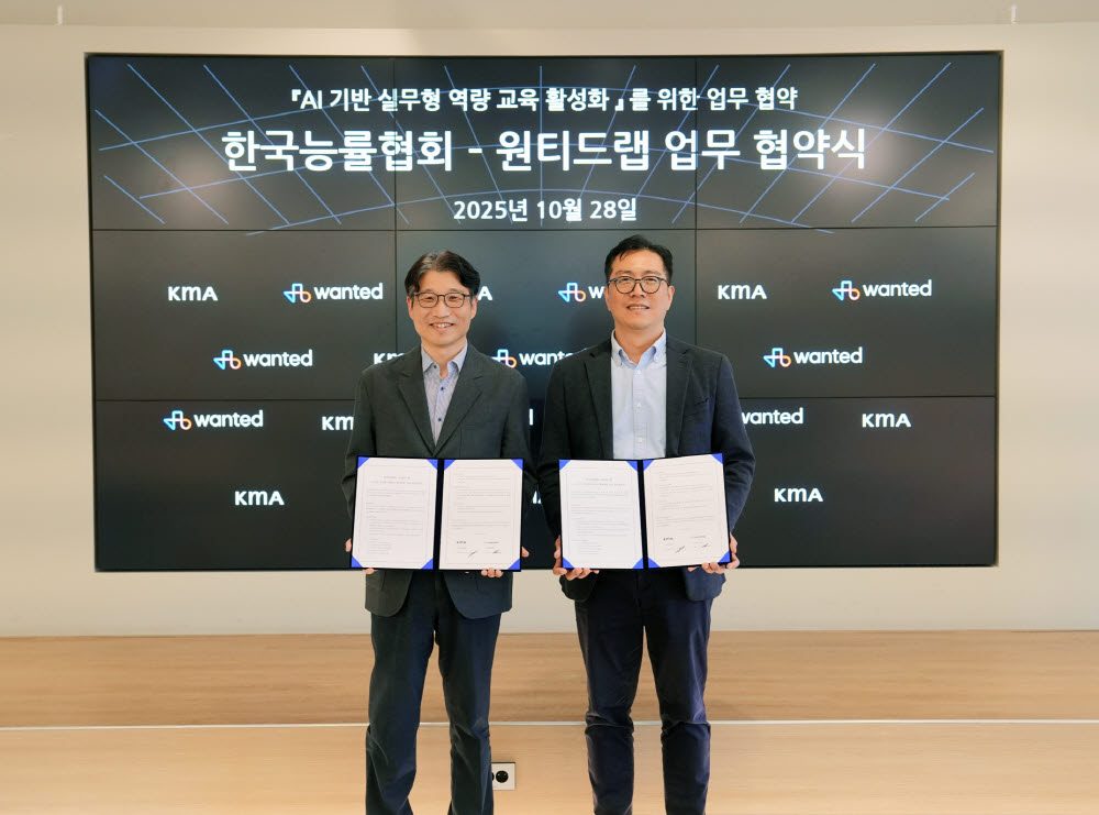 원티드랩은 한국능률협회(KMA)와 ‘AI 기반 실무형 역량 교육 활성화를 위한 업무협약’을 체결했다고 11월 4일 밝혔다. 이번 협약은 생성형 AI를 기반으로 실무형 AI 교육 생태계를 조성하고, 기업의 AI 전환 역량을 강화하는 데 목적을 둔다. 양사는 AI 교육 프로그램 공동 개발, 기업 대상 AI 실무 과정 확대, 원티드랩의 생성형 AI 플랫폼 ‘원티드 LaaS’ 기반 AI 몰입 체험 교육 프로그램 도입 및 확산 등을 단계적으로 추진할 계획이다. KMA는 원티드랩의 AI 교육 프로그램을 활용해 기업 맞춤형 교육 과정을 개발하며, 원티드랩은 KMA 고객사에 AI 활용 전략, 업무 자동화, 지식 협업 환경을 지원한다. 이번 협약을 통해 양사는 기업의 AI 리터러시를 높이고 미래형 인재 양성을 위한 AX 교육·솔루션 생태계를 함께 조성해 나갈 방침이다.