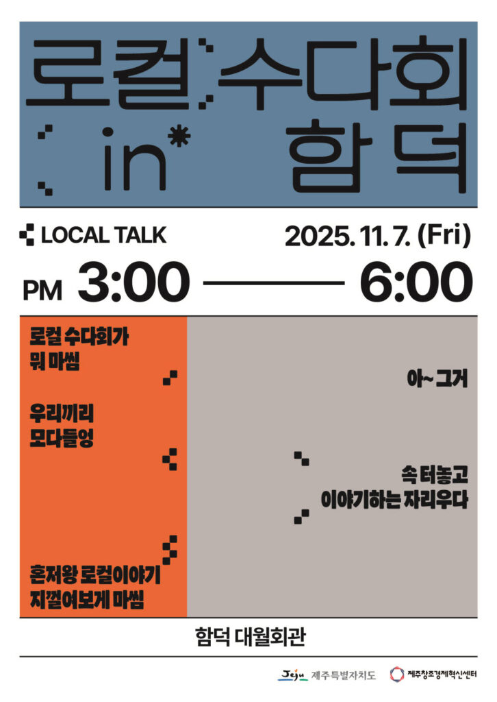 제주창조경제혁신센터는 11월 7일 제주시 조천읍 함덕리에서 ‘로컬 수다회 in 함덕’을 개최한다. 이번 행사는 지난 10월 구좌읍 세화리에 이어 두 번째로 열리는 지역 소통형 프로그램으로, 함덕리의 관광 중심 경제 구조에서 지역민 주도의 크리에이터 경제 구현과 지속 가능한 상생 생태계 전환을 모색한다. 특히 함덕4구가 ‘제주시 골목형상점가’로 지정된 만큼, 지역 상인과 주민이 함께 참여하는 공동체 기반의 상권 회복 모델에 주목하고 있다. 수다회는 지역민이 직접 참여해 지역 개선 방향과 가능성을 논의하는 토크쇼 형식으로 진행되며, 지역 주민 활동 사례 발표, 정부 및 지자체 정책 안내, 로컬 크리에이터 육성을 통한 상생 협력 방안 모색, 네트워킹을 통한 경험 공유 등이 주요 프로그램이다. 제주센터 이병선 대표는 “지역 소상공인과 지역민이 함덕의 가치를 논의하고 성장 방향을 모색하는 실질적인 소통의 장이 될 것”이라며, 향후 마을 단위 로컬 수다회를 확대하여 협력 모델을 확산하겠다고 밝혔다. 김태완 제주특별자치도 새정부경제정책추진단장은 함덕이 관광 중심지를 넘어 지역 공동체가 주도하는 지속 가능한 경제 모델로 발전하는 계기가 될 것이라고 강조했다. ‘로컬 수다회 in 함덕’은 제주센터 홈페이지를 통해 11월 5일 18:00까지 사전등록이 가능하다.