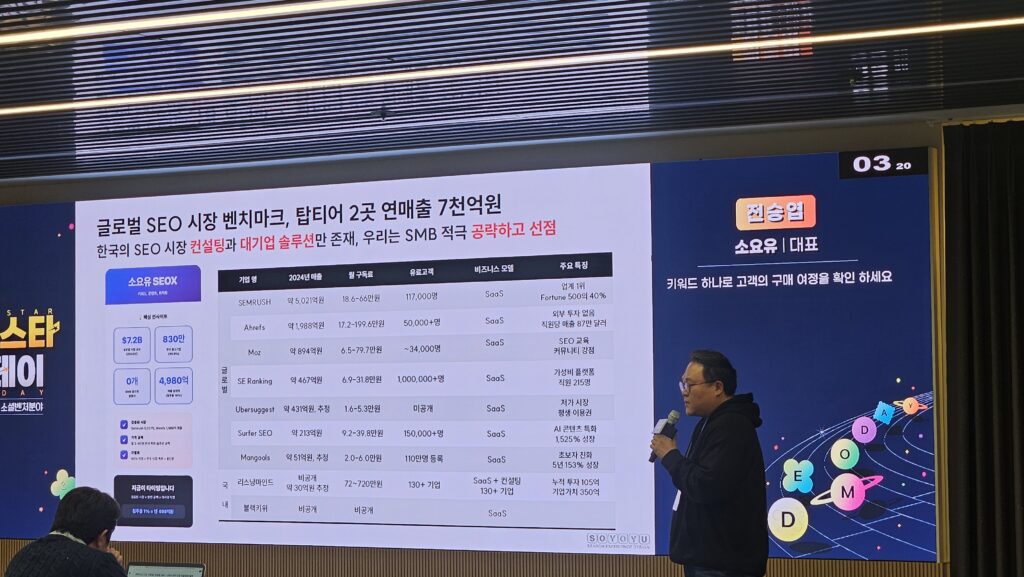 소요유는 고객의 검색 경험을 혁신하기 위한 검색최적화 솔루션을 개발 중이다. 스타트업 다수가 뛰어난 제품을 보유하고도 고객 유입에 어려움을 겪고 있다는 문제에서 출발한 이 솔루션은 키워드 탐색–콘텐츠 제작–사이트 최적화라는 세 단계의 핵심 가설을 기반으로 한다. 실제 파일럿 프로젝트에서 방문자 수 8배, 자연 유입 25배 증가라는 성과를 입증했다. 단순 키워드 분석이 아닌 고객의 구매 여정을 분석하는 AI 기반 콘텐츠 최적화 시스템을 제공한다. 실시간 경쟁 콘텐츠를 6차원으로 분석해 검색 노출 가능성이 높은 콘텐츠 작성을 돕고 이를 위한 3건의 특허를 출원 중이다. 소요유는 대기업 중심의 SEO 시장에서 벗어나 소상공인과 스타트업 대상의 SaaS형 구독·API 기반 솔루션으로 시장을 선점하고자 한다.