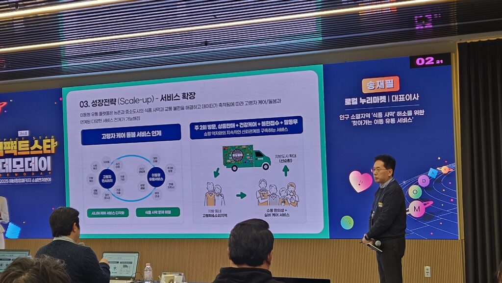 로컬누리마켓은 인구 소멸 지역 식품 사막 해소를 위한 찾아가는 이동형 유통 서비스를 통해 인구소멸, 고령화, 식품 사막 문제 3가지를 해결하고자한다. 이동트럭은 1톤 미만 소형트럭을 개조해 콜드체인 기반의 탄소저감 전기차며 본부, 상품공급업자, 판매 대행 개인사업자,고객을 잇는 4자간 운영 계약 채결해 수익을 공유해서 상생할 예정이다. 수익화모델은 가맹비, 월로열티 등이다. 고령자 구매 데이터 확보를 통해 고령자케어 돌봄과 연계된 다양한 서비스 전개가 가능할 것으로 기대하고 있다. 올해 사업화 추진하고 내년부터 시범사업을 진행, 27년부터 30년까지 500대 이상 운영 확대를 목표하고 있다.