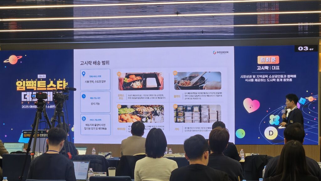고시락은 시장상권, 지역골목 소상공인들과 협력해 식사를 제공하는 도시락 중개 플랫폼을 운영한다. 골목 상권 소상공인의 고충문제, 중노년층의 일자리 창출 문제 해결을 돕는다. 타깃시장은 식사 비제공 기업, 프랜차이즈 숙박시설, 아파트, 대학교 기숙사 등으로 현재 서울 내 45개 고시원·숙박 지점과 MOU를 맺고 있다. 숙박시설 정보 플랫폼을 함께 운영하며 광고 연계를 통한 홍보도 진행 중이다. 올해 목표였던 매출 7,900만 원을 초과 달성해 1억 원을 전망하고 있으며 내년에는 전국 확장을 추진한다. 또 베트남에서 K-레스토랑 및 도시락 업체와 MOU를 맺고 현지 진출을 준비 중이며 장기적으로 미국 등 글로벌 시장으로 진출할 계획이다.