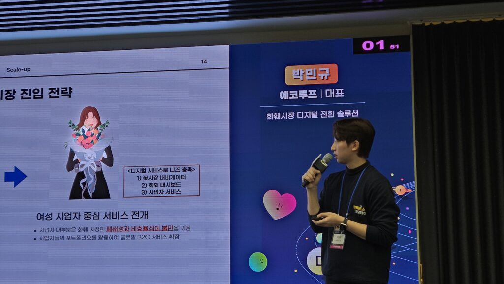 에코루프는 오랜 기간 유지돼온 폐쇄적이고 비효율적인 꽃 유통 구조를 혁신하는 화훼시장 디지털 전환 솔루션을 제공한다. 현금 위주 거래, 품질 정보 왜곡, 카르텔식 관행으로 인한 정보 비대칭 문제를 해결하기 위해 데이터 기반의 유통 혁신 플랫폼을 개발하고 있으며 도매업체 20여 곳, 소매업체 4만여 곳의 네트워크를 바탕으로 신뢰성 높은 데이터를 수집·정제하고 있다. 이를 기반으로 시장 시세 리포트, 거래 서류 자동화, 유통 데이터 시각화 서비스를 제공한다. 특히 OCR 기술을 활용한 전자서류 자동화와 실시간 시세 분석을 통해 유통 투명성을 높이고 꽃 시장의 신뢰 회복과 효율적 거래를 목표로 한다. 향후 구독형(월 9,900원)과 유통 수수료(10~20%) 기반 모델로 사업을 확장하며 해외 소비자 대상 서비스로 글로벌 시장 진출을 준비할 계획이다.