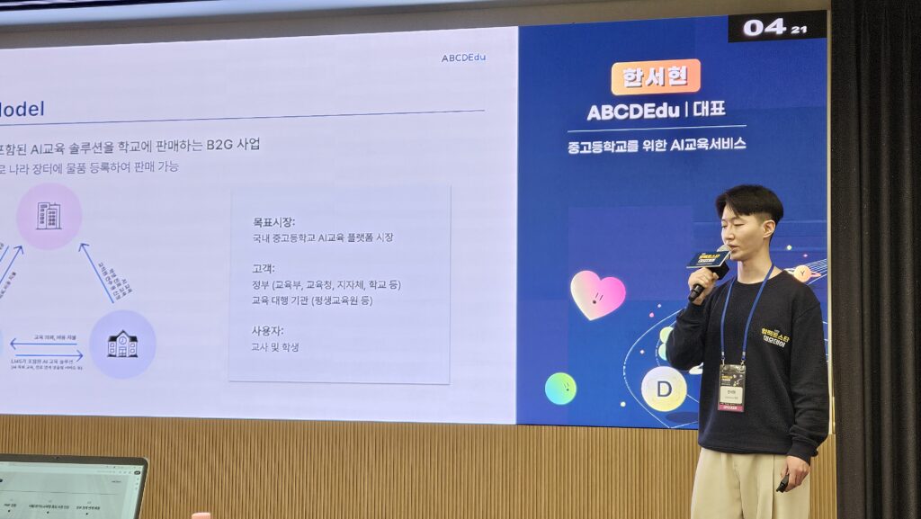 ABCD Edu는 AI 인재 양성을 위한 교육격차 해소에 나선 에듀테크 스타트업이다. 현재 학교 현장에서는 AI를 전문적으로 가르칠 교사가 부족하고, 학생 눈높이에 맞는 콘텐츠도 거의 없는 상황이다. ABCD Edu는 이러한 문제를 해결하기 위해 교사용 AI 학습관리시스템(LMS)과 실습 환경, 커리큘럼을 제공하는 플랫폼을 개발 중이다. 이를 통해 교사들은 전문성이 없어도 자신 있게 AI 수업을 진행할 수 있다. ABCD Edu는 B2G 중심의 코딩 위주 교육과 달리, 중·고등학생 수준에 맞춘 AI, Big Data, Coding, Domain 네 가지 핵심 영역으로 구성된 체계적 AI 교육을 제공한다. 현재 서울과 부산 지역 고등학교를 중심으로 시장 진입을 준비 중이며, AI 교육의 표준 플랫폼으로 성장하는 것을 목표 하고 있다.