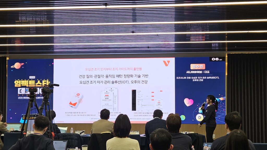 시니어바이브는 중장년층의 전환기 질환 관리 중에서도 오십견 예방과 회복을 돕는 자가 건강관리 솔루션을 오후의건강을 개발한다. 사용자가 앱과 기기, 전문가 리포트를 통해 자신의 관절 상태를 정량화하고 관리할 수 있는 시스템을 구축했다. 이 솔루션은 어깨 관절 움직임과 패턴을 분석해 점수화하고, 개선 여부를 시각적으로 제공해 사용자가 좋아지고 있다는 경험을 느낄 수 있게 돕는다. 시니어바이브는 50견 자가관리 기기와 리포트를 중심으로 시작해, 향후 갱년기 등 프리시니어 전환기 질환 전반으로 확장할 계획이다. 이미 B2B 기업과 협약을 맺어 기술 상용화 기반을 마련했으며, 일본 시장을 1차 타깃으로 실증 및 런칭을 준비 중이다.