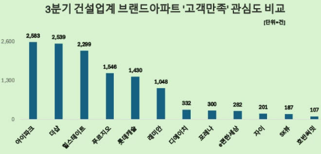 데이터앤리서치가 올해 3분기(7\~9월) 국내 시공능력평가 상위 12개 건설사의 브랜드 아파트에 대한 ‘고객만족’ 관련 온라인 포스팅 수를 분석한 결과, HDC현대산업개발의 아이파크가 2,583건을 기록하며 관심도 1위를 차지했다. 포스코이앤씨의 더샵이 2,539건으로 2위, 현대건설의 힐스테이트가 2,299건으로 3위를 기록하며 뒤를 이었다. 한편, 조사 대상 전체 브랜드 아파트의 고객만족 포스팅 수는 1만 2,854건으로, 전년 동기(7,822건) 대비 64.33% 급증한 것으로 나타나 건설업계의 전사적인 고객 만족 노력 확대가 수치로 입증됐다.