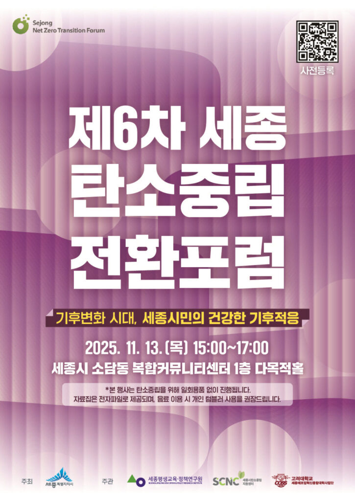 세종특별자치시가 오는 13일 소담동 행복누림터에서 ‘제6차 세종탄소중립전환포럼’을 개최한다. 이번 포럼은 세종시와 관련 기관이 공동으로 마련했으며, 기후변화가 시민 건강과 일상에 미치는 영향을 짚고 지역 차원의 대응 전략을 모색하는 자리다. 성균관대 김종헌 교수가 기후변화에 따른 건강영향을 발제하고, 한국환경연구원 김윤정 부연구위원이 삶의 질 관점에서 기후정의 과제를 발표한다. 특별발표에서는 고려대 학생이 3D 프린팅 물 필터를 활용한 탄소중립 기술을 소개한다. 이어 전문가들이 참여하는 토론에서 건강 정책과 대응 방안이 집중 논의될 예정이다. 이번 행사는 일회용품 없는 친환경 방식으로 진행되며, 자료집은 전자파일로 제공된다. 세종시는 이번 포럼을 통해 시민들의 기후적응 역량을 높이고 건강한 도시로 나아가기 위한 기반을 마련한다는 목표다.