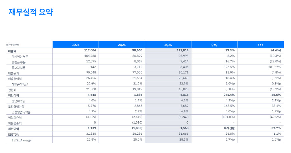 쏘카가 2025년 3분기 실적을 발표하며 5개 분기 연속 영업흑자를 기록했다. 매출은 전년 동기 대비 4.4% 감소한 1,118억원을 기록했으나, 차량 운영 효율화와 비용 구조 개선에 힘입어 영업이익은 47% 증가한 68억원을 달성했다. 당기순이익 역시 16억원으로 흑자를 이어가며 수익성 기반의 경영 전략이 성과로 나타났다. 특히 차량 가동률은 39.1%로 상승했고, 차량 1대당 매출도 171만원을 기록하며 수익성을 견인했다. 쏘카는 ‘쏘카 2.0’ 전략 고도화를 통해 이익 극대화 체제를 구축하고 중장기 성장 동력을 마련할 계획이다.