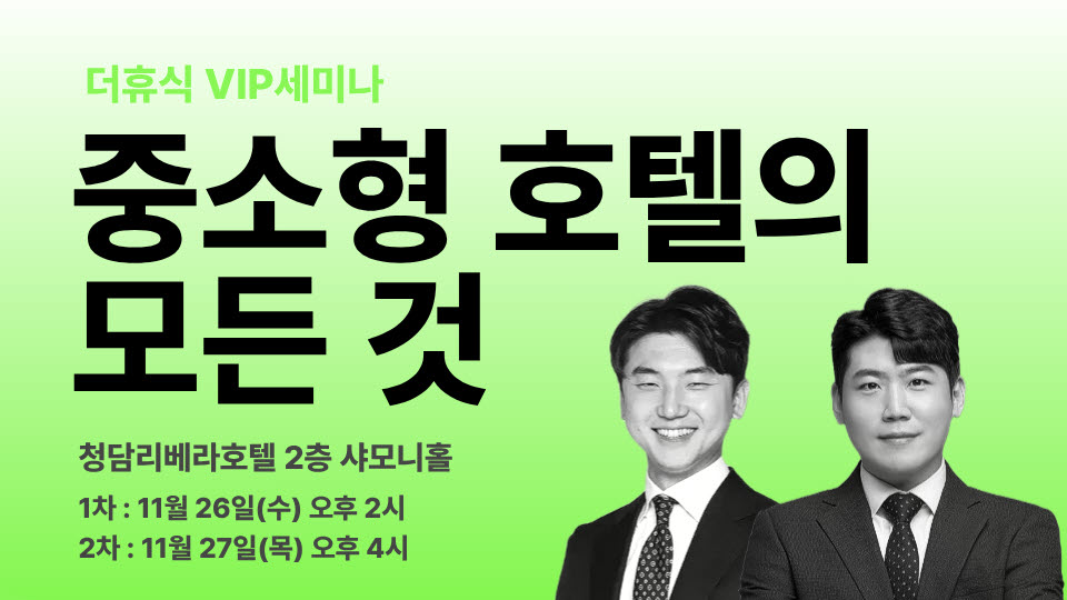 AI 기반 숙박 솔루션 기업 더휴식이 오는 11월 26일과 27일 청담리베라호텔에서 ‘중소형 호텔 숙박 부동산’ VIP 세미나를 연다. 이번 행사는 불확실한 시장 속에서도 안정적인 현금 흐름을 창출하는 숙박 자산의 투자 가능성을 집중 조명한다. 세미나에서는 김준하 대표가 지방 숙박 부동산의 재부상 배경과 시장 흐름을 데이터로 분석하고, 이재경 부문대표가 실제 개발 사례를 통해 수익 구조를 설명한다. 강연 후에는 실무진과의 테이블 미팅이 마련돼 맞춤형 상담이 가능하다. 참가자는 대출, 개발, 운영 등 구체적 전략을 확인할 수 있으며, 낮은 수익률에 고민하는 소규모 건물 투자자들에게도 대안이 될 전망이다. 숙박 부동산은 금리와 외부 변수에 흔들리지 않고 매월 안정적 수익을 창출하는 구조적 장점이 강조되며, 이번 세미나가 실질적 투자 전략을 제시하는 자리로 기대를 모으고 있다.