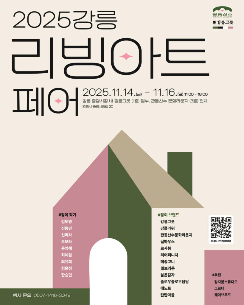 (재)강원창조경제혁신센터의 지원을 받는 관동산수 문화라운지가 주관하는 ‘2025 강릉리빙아트페어’가 오는 11월 14일부터 16일까지 강릉 중앙시장 일대에서 열린다. ‘로컬 감성 리빙’과 ‘일상 속 예술’을 주제로 강릉그릇(1층 일부)과 관동산수 문화라운지(3층) 전관에서 진행되는 이번 행사는 지역의 생활문화와 예술을 결합한 새로운 전시형 페어를 선보인다. 김도영, 신동민 등 강원특별자치도와 수도권을 중심으로 활동하는 작가 9인이 참여하며, 이 중 발달장애 예술가 3인이 포함돼 다양성과 포용의 가치를 더한다. 강플라워, 닐하우스 등 지역색과 세련된 디자인이 돋보이는 다양한 리빙 브랜드도 소개된다. 3층 공간은 리빙존, 아트존, 미팅존으로 구성돼 전시·판매와 협업 상담이 함께 이뤄지는 복합형으로 운영된다. 관람은 매일 오전 11시부터 오후 6시까지 무료이다.