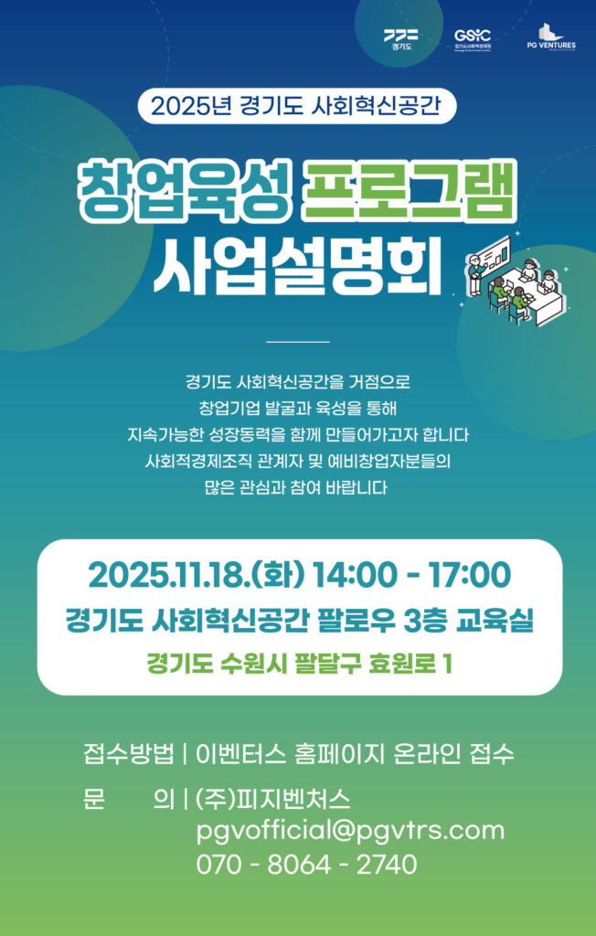 (주)피지벤처스가 주관하는 ‘2025 경기도 사회혁신공간 창업육성 프로그램 사업설명회’가 개최된다. 이번 설명회는 경기도 사회혁신공간을 거점으로 창업기업 발굴 및 육성을 통해 지속가능한 성장 동력을 마련하는 것을 목표로 한다. 사회적경제조직 관계자와 예비 창업가들의 많은 관심이 예상된다. 사업설명회는 2025년 11월 18일 화요일 오후 2시부터 5시까지 경기도 수원시 팔달구 ‘경기도 사회혁신공간 팔로우’ 3층 교육실에서 진행된다. 온라인 사전 접수는 11월 17일 월요일 오후 3시까지 이벤터스 홈페이지를 통해 가능하며, 행사 당일 오후 1시부터 2시까지 현장 접수도 병행된다.