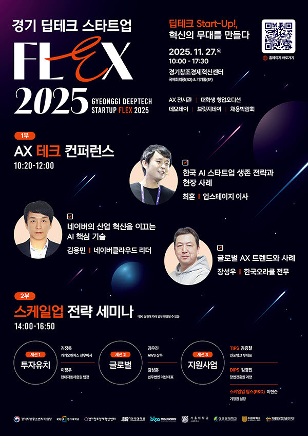 경기지방중소벤처기업청을 비롯한 8개 경기지역 창업지원기관이 AI 및 딥테크 스타트업의 역동적 성장을 목표로 「경기 딥테크 스타트업 Flex 2025」를 개최한다. 2025년 11월 27일 경기창조경제혁신센터에서 열리는 이번 행사는 AX 기술동향을 공유하는 컨퍼런스를 중심으로 진행된다. 주요 기업 연사가 참여하는 AX 테크 컨퍼런스, 투자 유치 노하우 및 글로벌 진출 전략을 다루는 스케일업 전략 세미나가 마련됐다. 이 외에도 AX 솔루션 전시·체험관과 함께 기관-기업, 기업-투자사 간 1:1 맞춤형 상담이 제공되는 브릿지데이가 운영된다. 우수 딥테크 스타트업의 데모데이와 청년 인재를 위한 채용박람회 등도 함께 진행되며, 참여를 원하는 중소기업 및 스타트업은 공식 홈페이지를 통해 신청할 수 있다.