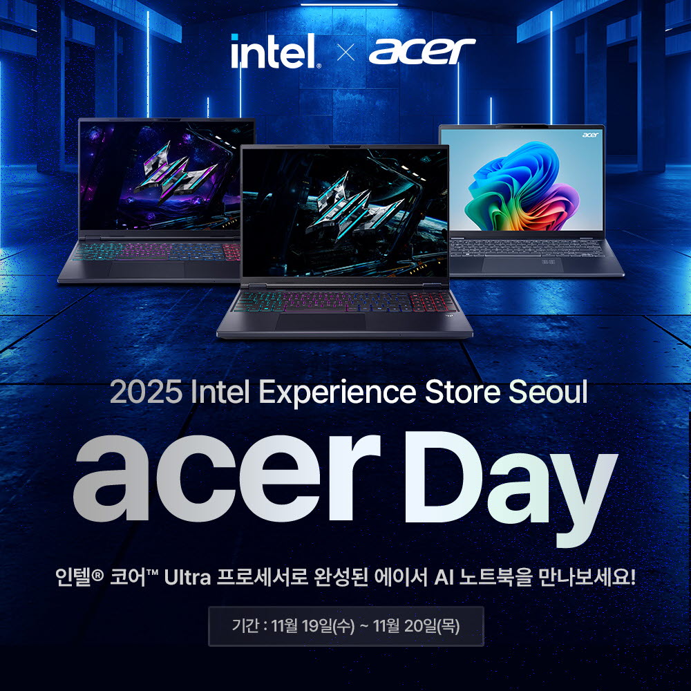 글로벌 PC 제조사 에이서가 서울 강남 OPUS 407에서 개최되는 ‘인텔 익스피리언스 스토어 서울 에이서 데이’를 통해 인텔® 코어™ Ultra 프로세서를 탑재한 최신 AI 기반 노트북 체험존을 운영한다. 오는 11월 19일부터 20일까지 이틀간 진행되는 이번 행사는 인텔이 전 세계 주요 5개 도시에서 동시에 진행하는 글로벌 팝업 쇼케이스의 일환으로, 아시아에서는 서울이 유일하게 선정됐다. 에이서는 프리미엄 게이밍 브랜드 ‘프레데터’와 슬림 노트북 라인업 ‘스위프트’ 등 AI PC 신제품을 전시하며, 방문객들에게 혁신적인 AI 기능과 사용 경험을 직접 제공한다. 현장에서는 에이서 공식 인스타그램 팔로우 이벤트 등 다채로운 프로그램도 함께 운영될 예정이다.