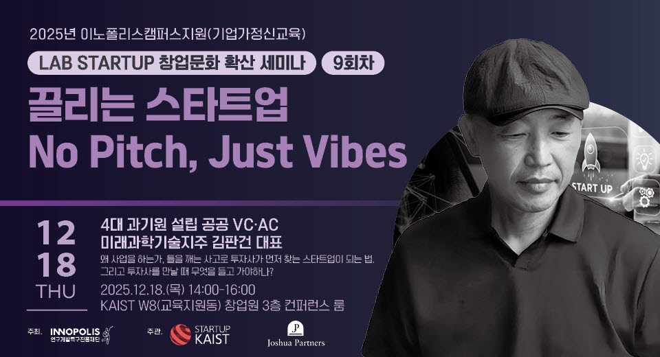 조슈아파트너스가 주관하는 ‘LAB STARTUP 창업문화 확산 세미나’ 9회차가 오는 12월 18일 목요일 오후 2시부터 4시까지 KAIST W8 창업원 3층 컨퍼런스 룸에서 개최된다. 이번 세미나는 ‘끌리는 스타트업 No Pitch, Just Vibes’를 주제로 진행되며, 미래과학기술지주 김판건 대표가 연사로 나선다. 창업 문화 확산에 초점을 맞춘 이번 행사는 동일한 신청 홈페이지를 통해 접수 가능하다.