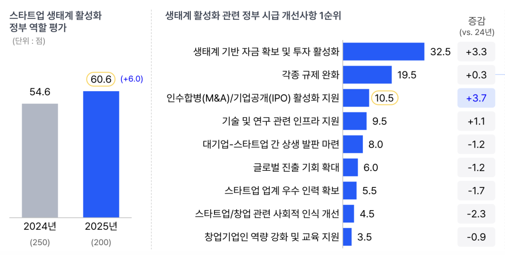 올해 창업자들의 생태계 전망은 전년 대비 6.6%p 상승했으며 다수의 응답자가 새 정부 정책에 대해 긍정적 변화를 예상했다. 창업지원기관이 꼽은 시급 과제는 생태계 기반 자금 확대(34%), 법·제도 개선 및 시장 진입 장벽 해소(20.3%), 후속 투자 및 공동투자 연계(10.5%), 특히 M&A·IPO 관련 니즈는 전년 대비 증가했다.