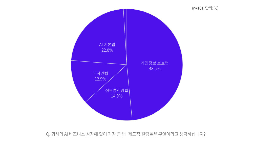스타트업얼라이언스는 국내 AI 스타트업 101개사를 대상으로 한 조사 기반 리포트를 21일 발표했다. 보고서는 AI 비즈니스 성장의 가장 큰 제약 요인으로 개인정보 보호법(48.5%)과 AI 기본법(22.8%) 등을 지목했다. 특히 정부가 우선적으로 완화해야 할 규제 분야로는 ‘개인정보 수집·이용 동의 제도’와 ‘저작권 학습데이터 활용 규제’가 가장 많이 꼽혔다. 스타트업얼라이언스는 데이터 활용 중심 패러다임 전환 등 5가지 정책적 시사점을 제시하며, AI 학습·개발의 기술적 특성과 법적 근거 간의 간극 해소를 촉구했다.
