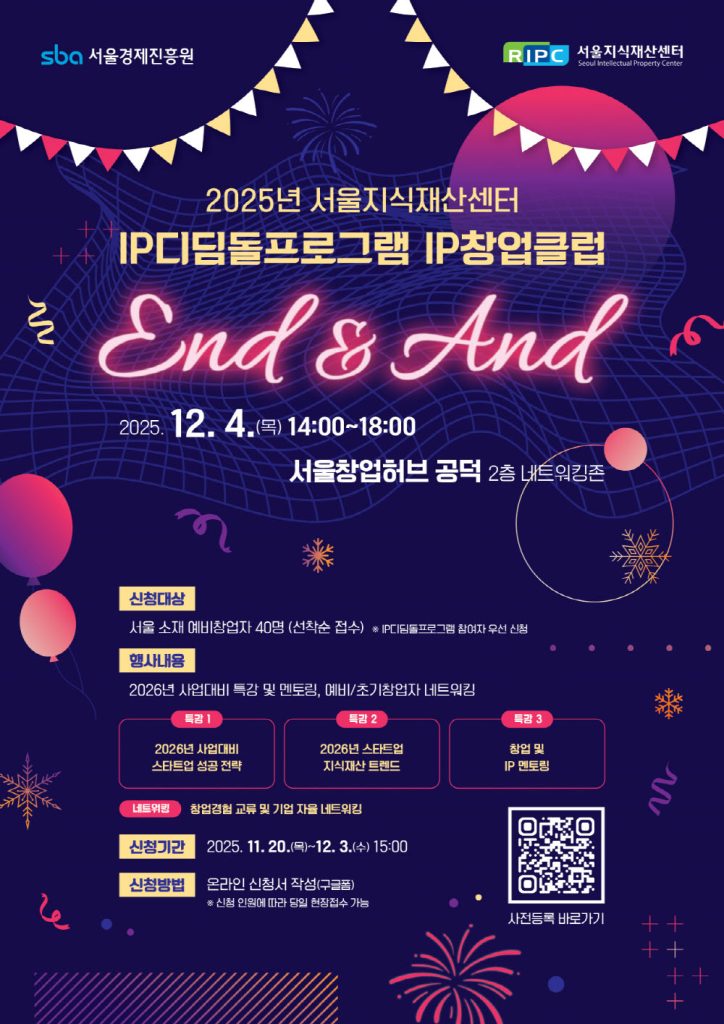 서울경제진흥원 서울지식재산센터가 오는 12월 4일 서울창업허브 공덕에서 ‘IP창업클럽 End&And’를 개최한다. 이번 행사는 2025년 지식재산 기반 창업지원 프로그램을 마무리하고 2026년 사업 대비를 위한 특강과 멘토링, 네트워킹을 제공하는 자리다. IP디딤돌프로그램과 연계해 교육·특허출원 지원을 받은 예비창업자에게 우선 신청 기회가 주어지며, 총 40명을 선착순 모집한다. 주요 프로그램은 스타트업 성공 전략, 지식재산 트렌드, 창업 및 IP 멘토링 등 세 가지 특강으로 구성돼 실무 중심의 강연과 전문가 조언을 통해 창업 이해도를 높이고 사업 방향성을 제시한다. 참가자들은 경험을 공유하며 자유롭게 교류할 수 있는 네트워킹도 함께 진행된다. 서울지식재산센터는 IP디딤돌, IP나래, 소상공인 지식재산 보호지원 등 다양한 사업을 운영하며 창업자에게 상담과 무료 멘토링을 제공해왔다. 2025년 지원사업은 이미 마감됐으며, 2026년 사업은 내년 2월부터 순차적으로 공고될 예정이다.