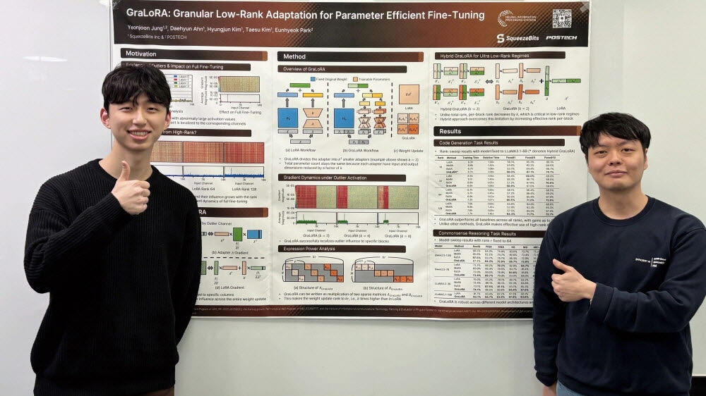 AI 경량화·최적화 전문 스타트업 스퀴즈비츠가 세계 최고 권위의 인공지능 학회 ‘뉴립스 2025(NeurIPS 2025)’에서 상위 약 3.2%의 논문에 주어지는 스포트라이트에 선정되는 쾌거를 달성했다. 포스텍과의 공동 연구로 발표된 논문은 ‘GraLoRA(Granular Low-Rank Adaptation)’ 기법을 담고 있다. GraLoRA는 대규모 인공지능 모델의 미세 조정(Fine-Tuning) 과정에서 기존 기술(LoRA)의 불안정성을 보완하기 위해 학습 단위를 더욱 세밀하게 재구성·조정하는 차세대 기술이다. 이를 통해 기업들은 동일한 비용으로도 더 안정적이고 우수한 품질의 AI 모델을 확보할 수 있게 될 전망이다. 해당 기술은 이미 허깅페이스(Hugging Face) 공식 라이브러리에 통합되어 업계 표준 구현으로 자리매김했다. 스퀴즈비츠는 이번 선정을 통해 기술 독창성과 실질적 효용성을 국제적으로 인정받았으며, 효율적인 AI 서비스 확대를 위해 연구 개발을 지속할 방침이다.