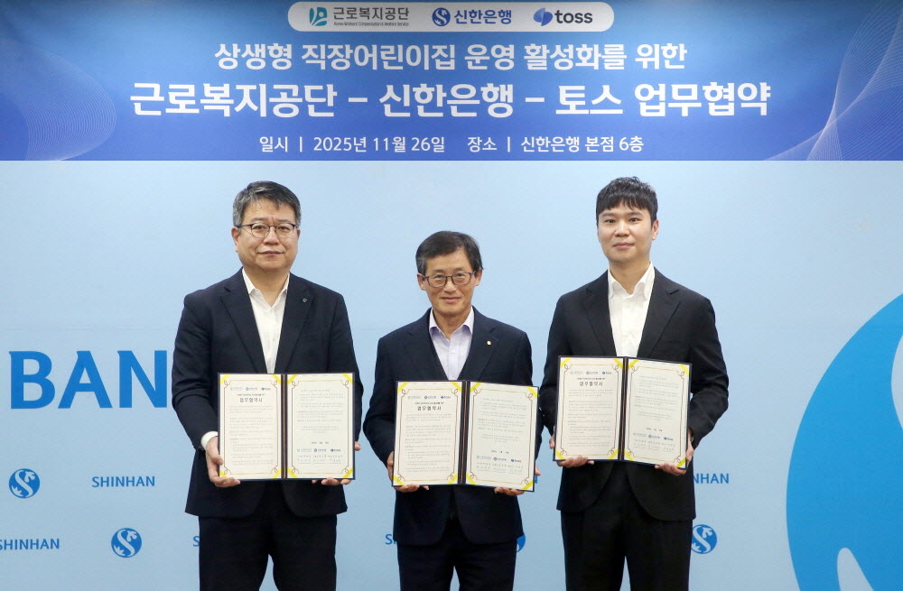 토스(비바리퍼블리카), 근로복지공단, 신한은행이 보육 인프라 공동 활용을 위한 ‘상생형 직장어린이집’ 업무협약(MOU)을 26일 체결했다. 세 기관은 상호 협력 체계를 구축하고, 각 사 임직원 자녀뿐 아니라 협력 중소기업 임직원 자녀에게도 어린이집을 공동으로 개방하기로 합의했다. 토스는 내년 3월 서울 강남구에 자체 직장어린이집 개원을 목표로 준비 중이며, 이를 포함해 ‘우리동네 토스 어린이집’ 제휴 시설 24곳과 함께 총 25개소의 보육시설을 임직원에게 제공할 예정이다. 이는 금융권의 보육 환경 개선 협력 사례로, 임직원의 일과 삶의 균형을 지원하고 돌봄 자원 공유를 통한 사회적 가치를 창출한다는 취지다.