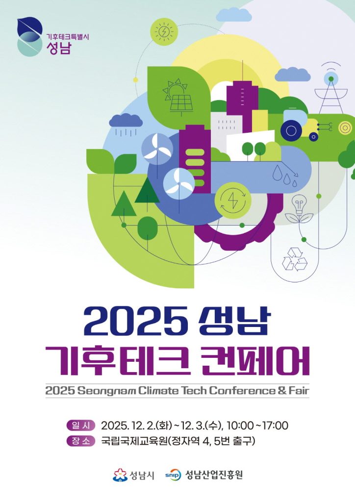 성남시가 주최하고 성남산업진흥원이 주관하는 ‘2025 성남 기후테크 컨페어’가 기후위기 선제적 대응과 기후테크 산업 성장 기반 마련을 목표로 전국 기초지자체 최초로 열린다. 행사는 12월 2일부터 3일까지 이틀간 국립국제교육원에서 개최되며, 시민과 기업이 함께하는 도시 단위의 기후테크 생태계 조성을 추진한다. 주요 프로그램으로는 이회성 무탄소연합회장(前 UN IPCC 의장)의 기조연설과 함께 ‘기후테크특별시 성남’ 비전선포식이 진행된다. 시민 참여 프로그램인 ‘도전\! 성남 기후 골든벨’과 O/X 퀴즈대회, 그리고 관내 기업의 성과를 시민평가단이 선정하는 ‘Master of Masters 성남시 기후테크 기업 성과공유회’가 마련된다. 또한 대기업·기관 참여 리버스 피칭, 네트워킹, 과학 커뮤니케이터 궤도의 토크콘서트, 멘토링 프로그램 등 B2B 및 시민 체험형 전시가 다채롭게 구성된다. 성남시는 이번 컨페어를 통해 기후테크 산업을 선도하는 도시로 도약할 계획이다.