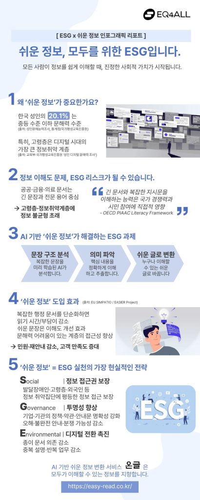 소셜벤처 이큐포올이 AI 기반 쉬운 정보 변환 서비스 ‘온글’을 활용한 ‘ESG × 쉬운 정보 인포그래픽 리포트’를 발표했다. 이 리포트는 발달장애인, 고령층, 외국인 등 정보 접근에 어려움을 겪는 이들이 공공·금융·의료 문서를 이해하는 데 발생하는 정보 불균형 문제를 데이터 중심으로 조명한다. 이큐포올은 이러한 정보 격차가 기업의 ESG 리스크로 작용할 수 있음을 지적하며, ‘쉬운 정보 기술’이 접근성 개선 및 고객 만족도 향상을 이끌어 사회적 가치 실현에 기여하는 핵심 ESG 전략이 될 수 있다고 강조했다. 이번 인포그래픽에는 한국 성인의 문해력 수준, 고령층의 디지털 문서 이해 격차, 공공 문서 난이도 문제와 더불어 AI 기반 쉬운 정보 변환 기술의 효과 및 ESG 관점에서의 적용 방향 등 주요 내용이 담겼다.