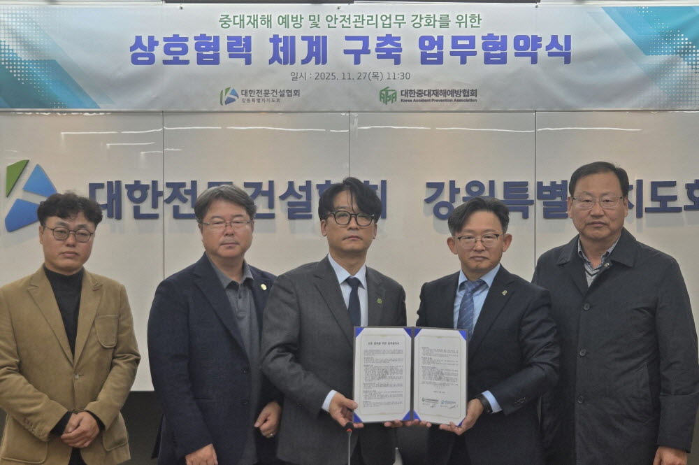 대한중대재해예방협회(협회장 정상민)는 지난 27일 대한전문건설협회 강원특별자치도회(도회장 오성진)와 중대재해 예방 및 안전관리 강화를 위한 업무협약(MOU)을 체결했다고 밝혔다. 양 기관은 강원 지역 건설업계의 안전 수준 향상을 목표로 ▲중대재해 예방 종합 서비스 및 안전 관리 플랫폼 제공 ▲시스템 기반 안전 관리 체계 구축 및 정보 공유 ▲상호 이익 증진을 위한 전략적 협력 관계 유지 등 세 가지 핵심 사항에 집중 협력한다. 이번 협약은 중·소규모 전문건설사업자들이 현장 안전관리 시스템 구축에 겪는 어려움을 해소하고 중대재해 ‘제로(Zero)’를 달성하기 위한 발판이 될 것으로 기대된다.