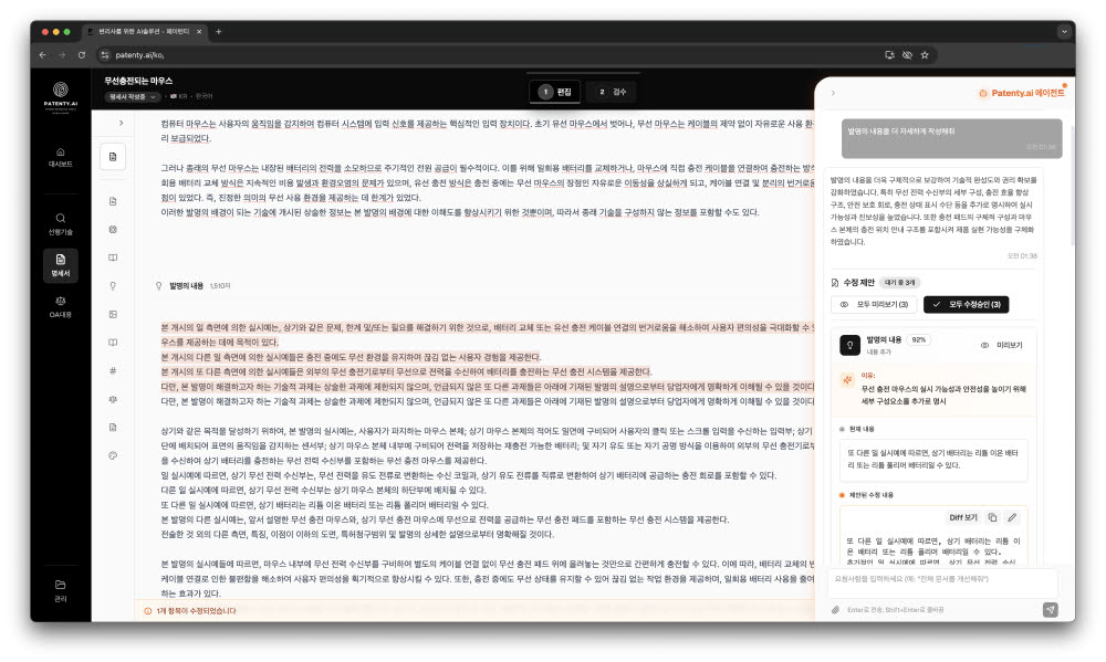 글로벌 특허 시장을 겨냥한 리걸테크 스타트업 페이턴티(Patenty.ai)가 12월 1일 특허 명세서 자동 작성 및 워크플로 관리 서비스 ‘페이턴티AI’를 정식 출시했다. 이는 기존 변리사가 4일 이상 소요하던 특허 출원서 작성을 1일(8시간) 이내로 획기적으로 단축해 업무 시간의 75%를 절감하도록 돕는 버티컬 AI 솔루션이다. 특히 변리사 실무에 특화된 ‘AI 협업 에디터’는 청구범위 초안 작성, 도면 자동 생성, 인라인 편집 등의 기능을 통해 전문성과 편의성을 높였다. 한·중·일을 포함한 IP5 주요 5개국 특허청 데이터로 학습해 아시아 시장에 최적화된 ‘네이티브 AI’를 탑재한 것이 특징이다. 페이턴티는 향후 OA(의견서) 대응 및 특허 포트폴리오 관리 기능으로 확장해 글로벌 IP 인텔리전스 플랫폼으로 도약할 계획이다.