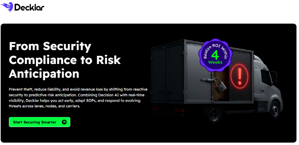 AI 기반 글로벌 공급망 솔루션 기업 데클라(Decklar, 구 롬비)가 운송 중 발생 가능한 위험을 사전에 감지하고 차단하는 ‘보안 위험 예측(Security Risk Anticipation)’ 솔루션을 발표했다. 이 솔루션은 기존의 물품 위치 추적 기능을 넘어, 운송 과정 전반의 패턴을 분석해 정상적인 이동 리듬이 깨지는 순간을 핵심 위험 신호로 해석하는 ‘패턴 기반 분석’ 기술을 적용했다. 데클라는 이를 통해 기업이 단순히 이벤트 발생 후 대응하는 것이 아닌, 위험 징후가 감지되는 즉시 선제적으로 개입할 수 있는 운영 체계를 구축하도록 지원한다. 실제 도입 고객들은 실시간 표준운영절차(SOP) 기반 초기 위험 탐지 정확도를 90% 이상 높이고, 불필요한 수동 조사 및 도난 클레임을 75% 이상 줄이는 등 운영 효율성을 대폭 향상시킨 것으로 나타났다.