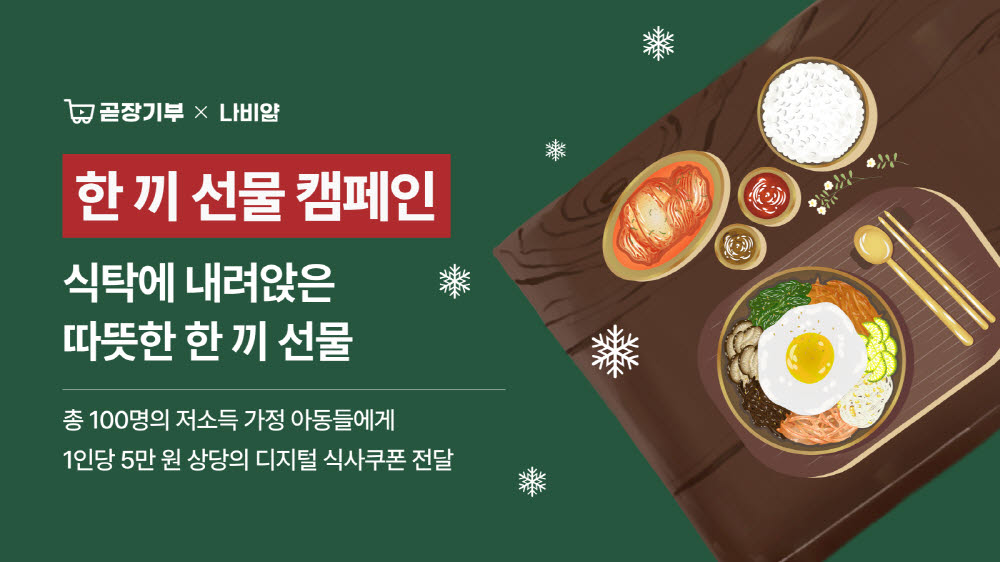 투명 기부 플랫폼 곧장기부와 B2B ESG 솔루션 기업 나눔비타민이 겨울철 결식 우려 아동·청소년 100명을 위해 ‘따뜻한 한 끼 선물’ 캠페인을 시작했다. 양사는 급식카드 아동·청소년에게 1인당 5만 원 상당의 모바일 식사 쿠폰을 지원한다. 기부금은 운영비 공제 없이 전액 지급되며, 아동들은 거주지 인근 나비얌 착한가게에서 식사를 선택할 수 있다. ‘따뜻한 한 끼 선물’ 캠페인은 곧장기부 홈페이지에서 누구나 참여 가능하다.