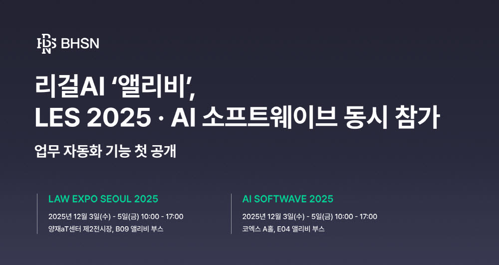 리걸AI 플랫폼 ‘앨리비’ 운영사 BHSN이 오는 3일부터 5일까지 진행되는 ‘법률 산업 박람회(LES 2025)’와 ‘AI 소프트웨이브 2025’에 동시 참가한다. BHSN은 LES 2025 전시 부스에서 앨리비 에이전트에 새로 추가되는 반복 업무 자동화 기능 ‘워크플로우’를 최초로 공개할 예정이다. 행사 둘째 날에는 임정근 대표가 컨퍼런스 연사로 나서 리걸AI 기반 업무 효율화 전략과 자동화의 실질적 생산성 개선 효과에 대해 소개한다. 이와 함께 AI 소프트웨이브 2025에서도 별도 부스를 운영하며 앨리비의 실제 기업 적용 사례와 AI 기술 고도화 방향을 공유할 계획이다.