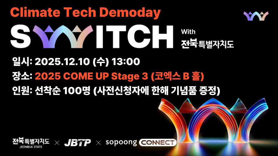 에너지 전환 및 기후테크 분야에 특화된 7개 스타트업 팀이 참여하는 IR 피칭 무대인 ‘SWITCH: Ground Stage 데모데이’가 개최된다. 참가자는 투자 유치 기회를 모색하는 동시에, 2026년 전북특별자치도가 계획하고 있는 기후테크 산업의 비전도 확인할 수 있다. 이 행사는 COMEUP Stage 3에서 열린다.